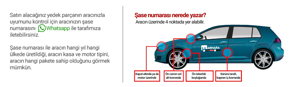 Aracınızın şasi numarasını müşteri temsilcilerimize bildirmeniz halinde hatalı ürün gönderiminin önüne geçilecektir. Şasi numarasıyla araç üreticisin hazırlamış olduğu katalog sistemine ulaşılabilmekte ve %100 doğru parça tespiti yapılabilmektedir.